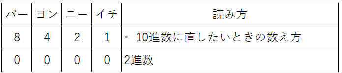 「いち・にー・よん・ぱー」とリズムで覚える(右から2倍づつ) - 4ビットの2進数(0000〜1111)を見て、
