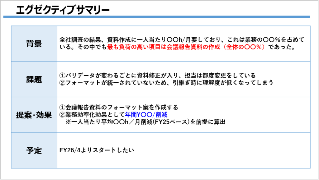 - Executive Summary(エグザマ)を最初に作り、概要を1〜2枚にまとめる