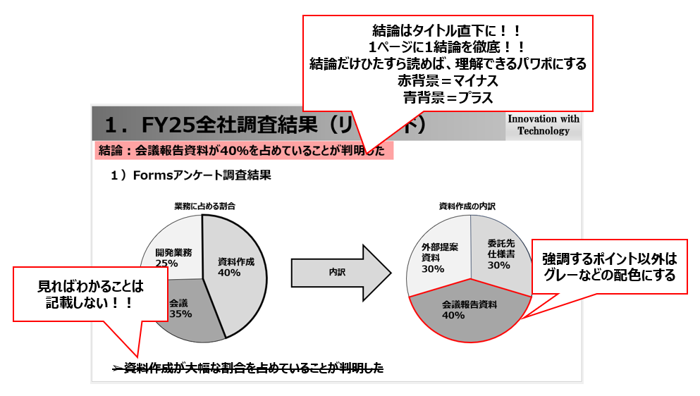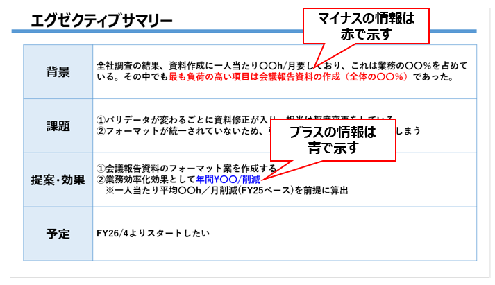 - 読み込まなくても、一目で「言いたいこと」が分かる