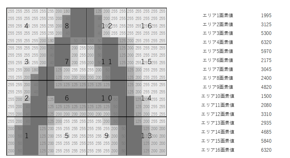 - グレースケールの合計値をブロックごとにまとめた