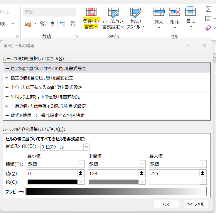 ①Excelで0〜255を色として表示する設定