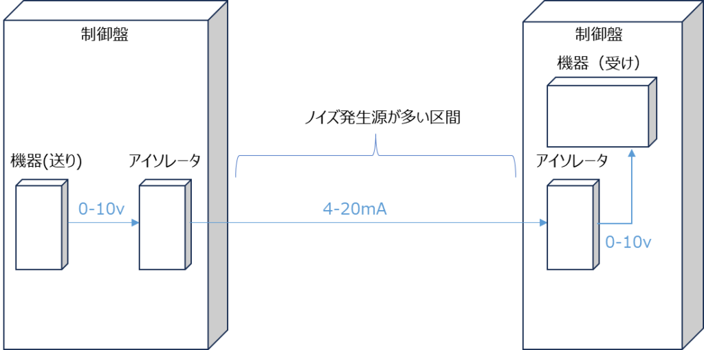 「送り側と同じ盤にアイソレーター(変換器)を入れて、0-10Vを4-20mAに変換し、盤〜盤は4-20mAで送る」