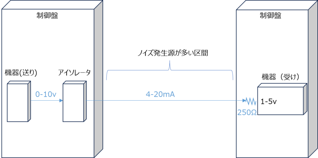 「受け側機器と同じ盤にアイソレーター(変換器)を入れて、盤〜盤で送ってきた4-20mAを0-10Vへ変換し、受け側機器へ入れる」