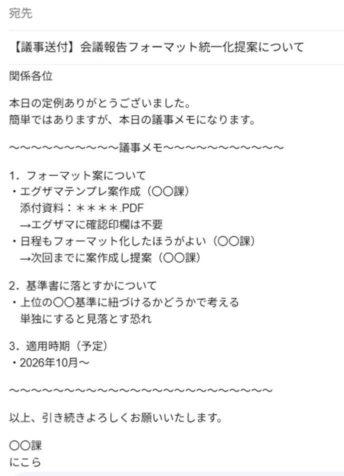 特に他部署が絡む会議では、取るだけで終わらせず、必ずメールで送るところまでがセットです。記録として残り、関係者の認識合わせにもなります。