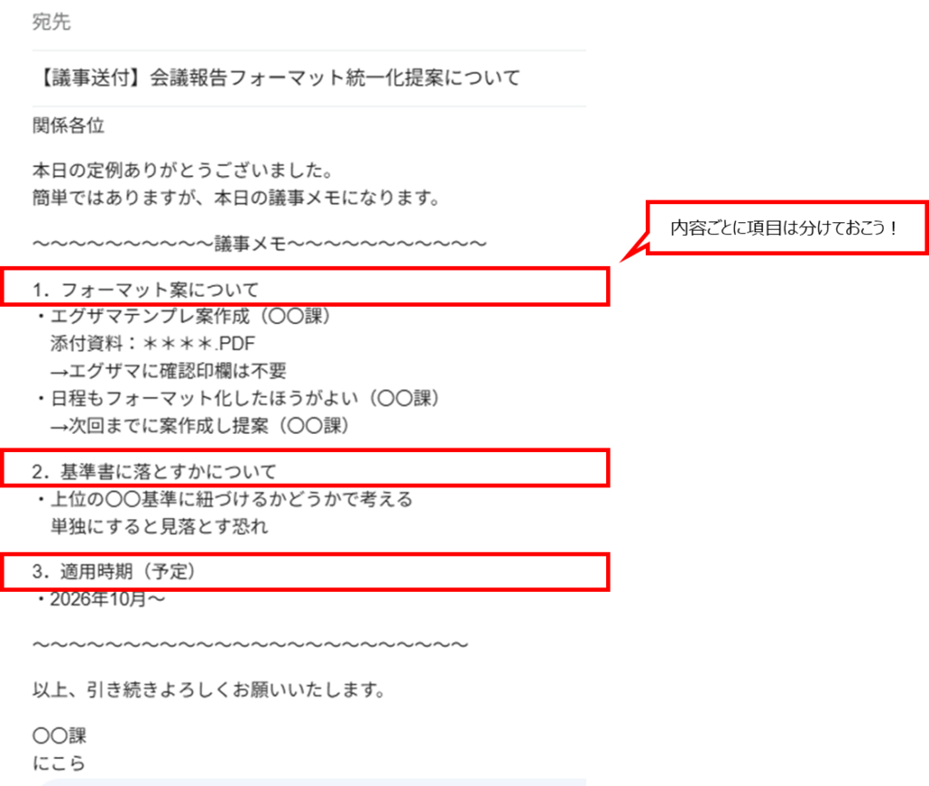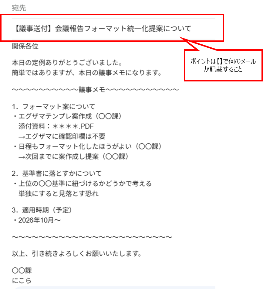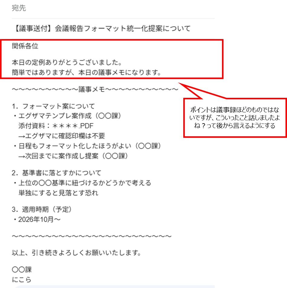 - 議事メモは会議後できるだけ早くメール送付