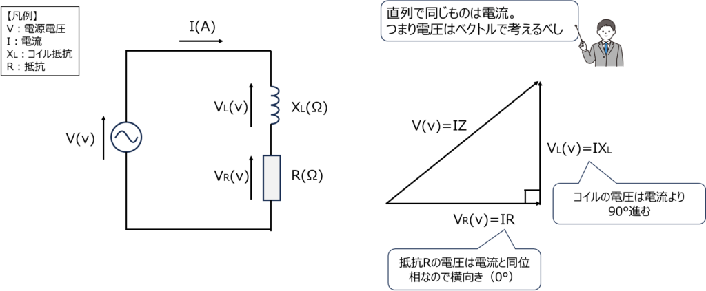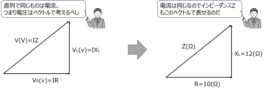 直列回路で三角形になるのは、電流が共通で、電圧に位相差があるからです。