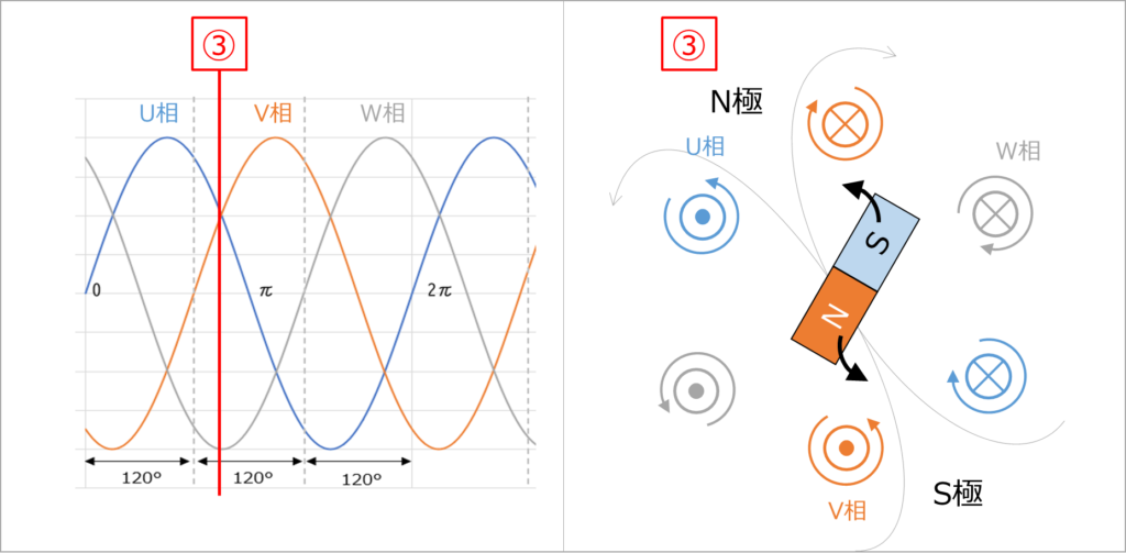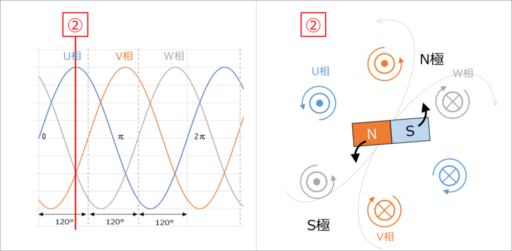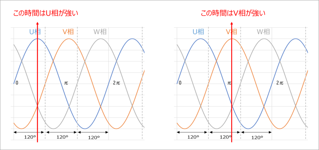 - ある瞬間はU相の磁界が強い