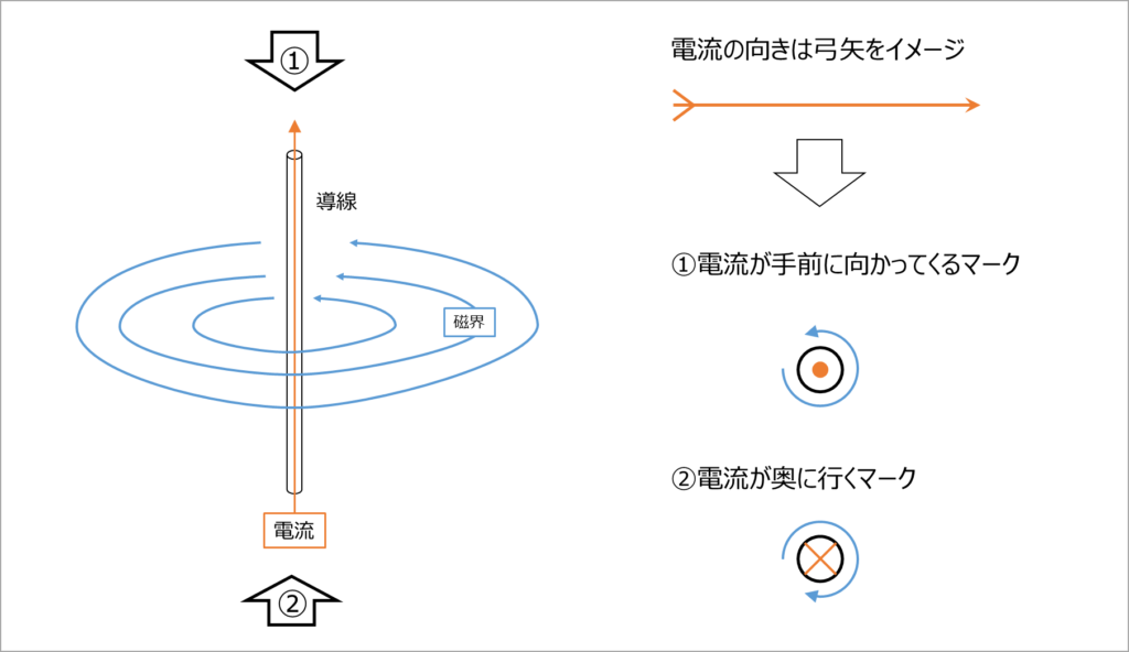 次の図では、導線を①真上から見たマーク、②真下から見たマークで示しています。