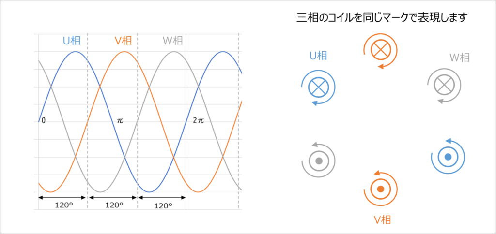 ここでは分かりやすく、U相、V相、W相の3つのコイルが、空間的に120°ずれて配置されていると考えます。