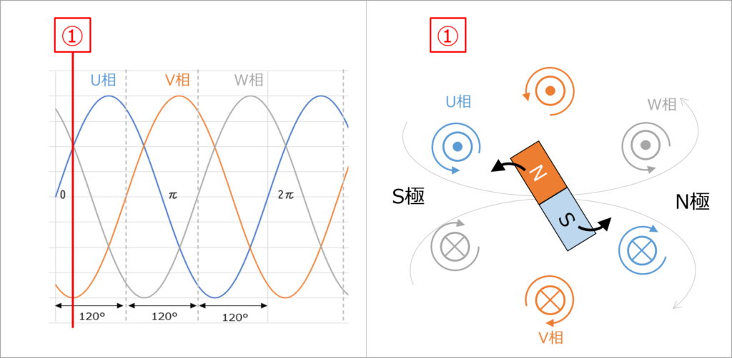 左のグラフ①の位置でU相とW相のY軸は+側にあり、V相が-側にあることが分かります。