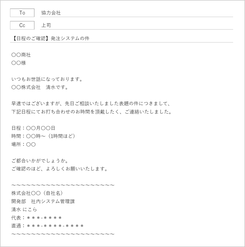 ここに必要な情報が記載されていれば、万が一、担当者が休みだったり、時間がたっても返信されなかったりした場合でも、相手側が対応しやすくなります。