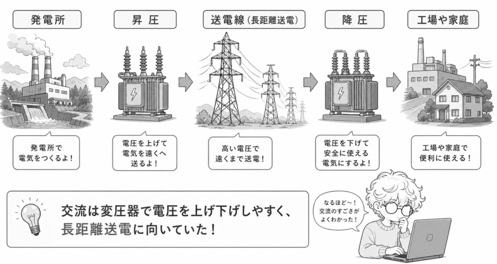 そして交流は、変圧器で電圧を上げたり下げたりしやすいという強みがありました。