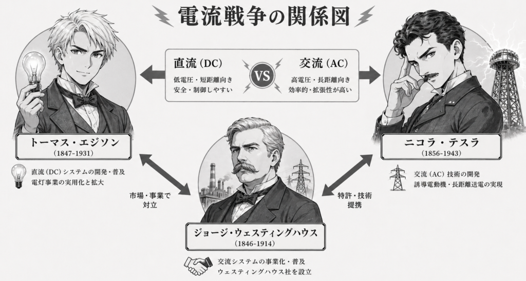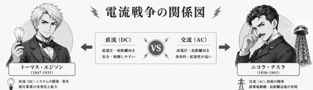 ここは、よく「エジソン vs テスラ」の二人のケンカみたいに語られますが、実際には次のような構図で見ると分かりやすいです。